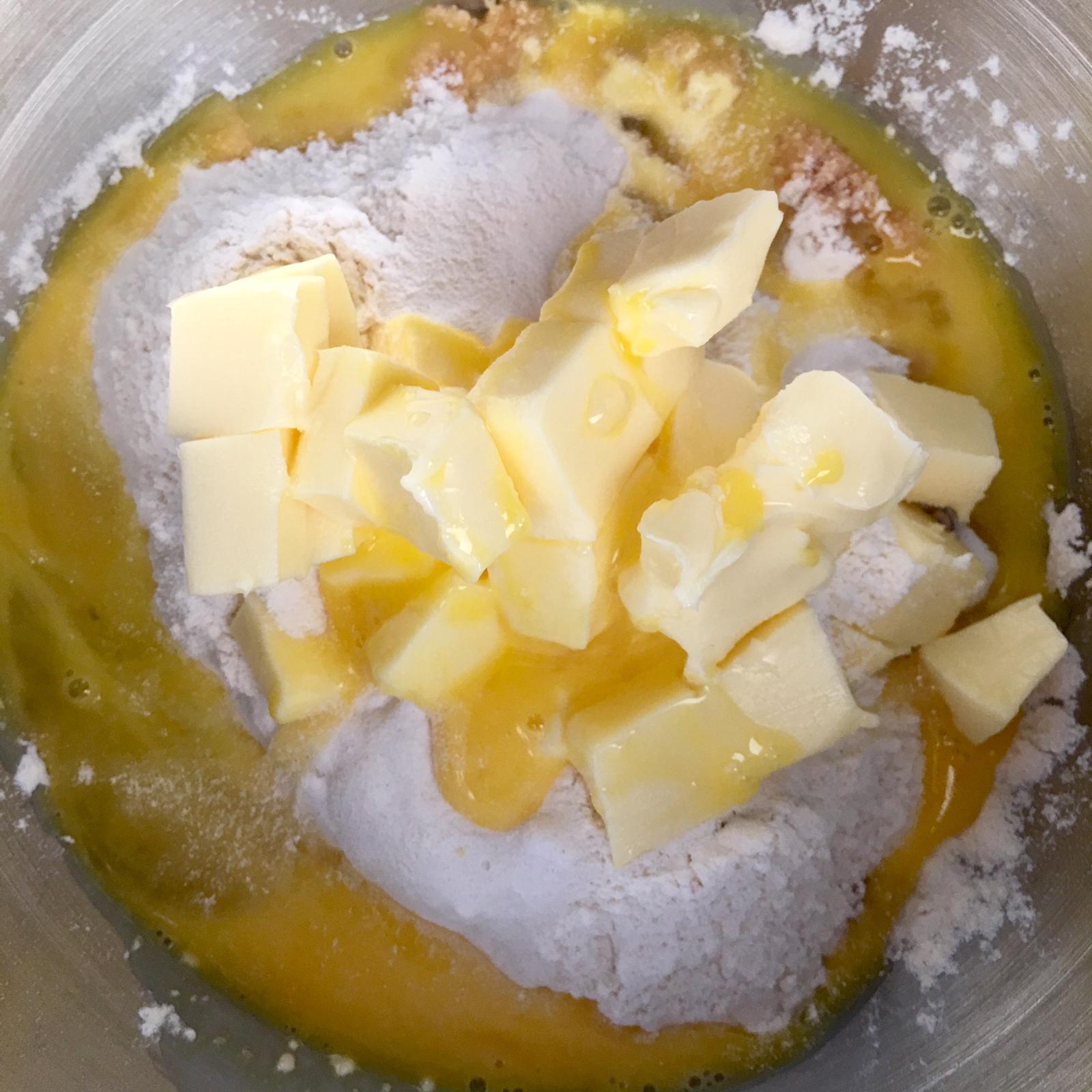 2. Trasferitela nel boccale della planetaria e aggiungete il restante zucchero, la farina, il burro morbido a pezzetti e l’uovo leggermente sbattuto.