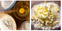 1. Preparate tutti gli ingredienti necessari. In una capiente ciotola inserite la farina setacciata e il burro tagliato a pezzetti. Lavorate velocemente con la punta delle dita per fare la sabbiatura.