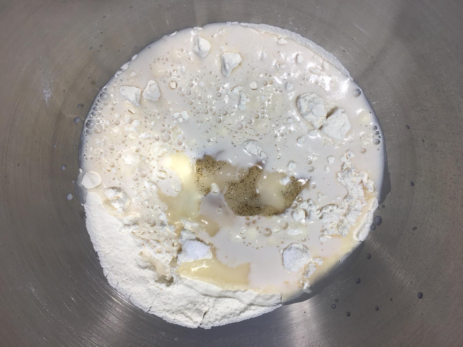 - Nella ciotola dell’impastatrice versate le due farine setacciate, lo zucchero, l’estratto di vaniglia, la scorza grattata del limone e il latte con il lievito. Impastare con la frusta ad uncino a velocità 2 per almeno 5 minuti (questa operazione si può fare anche a mano, occorrerà solo più tempo).