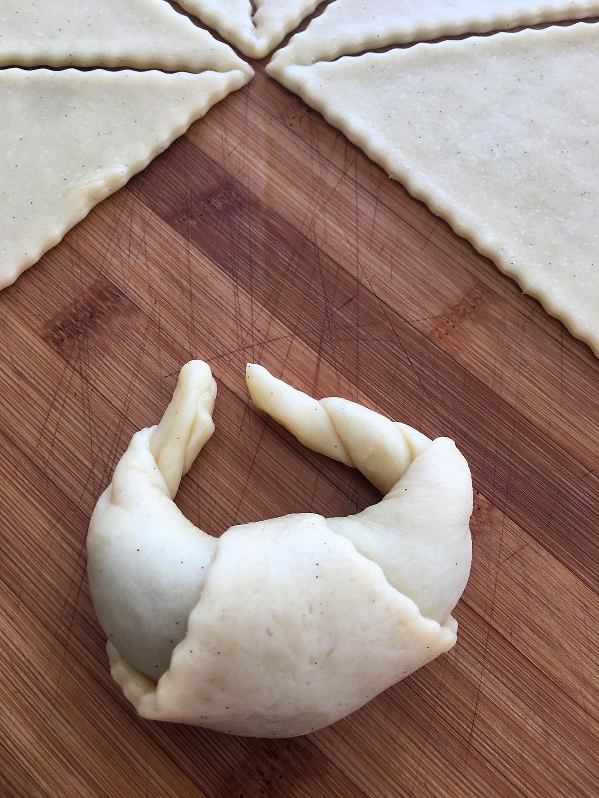 - Arrotolate i cornetti dalla base alla punta dando loro la classica forma del cornetto.