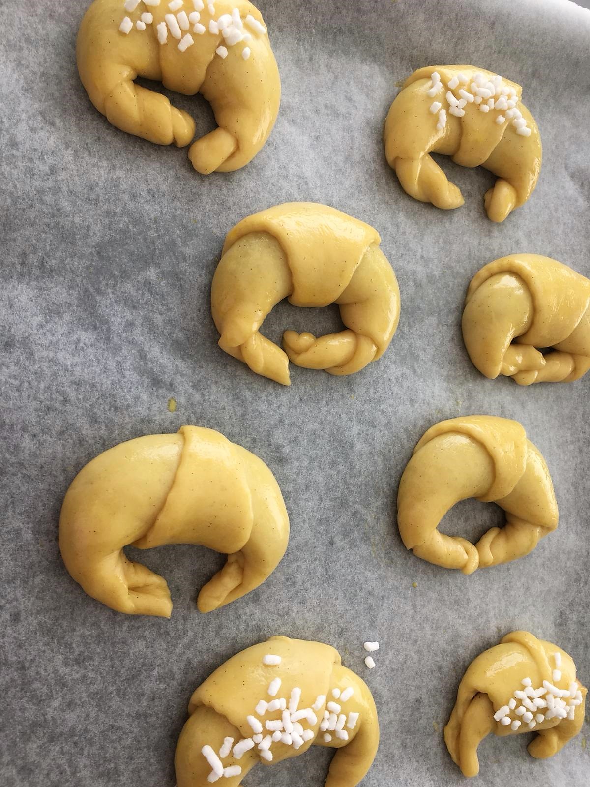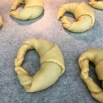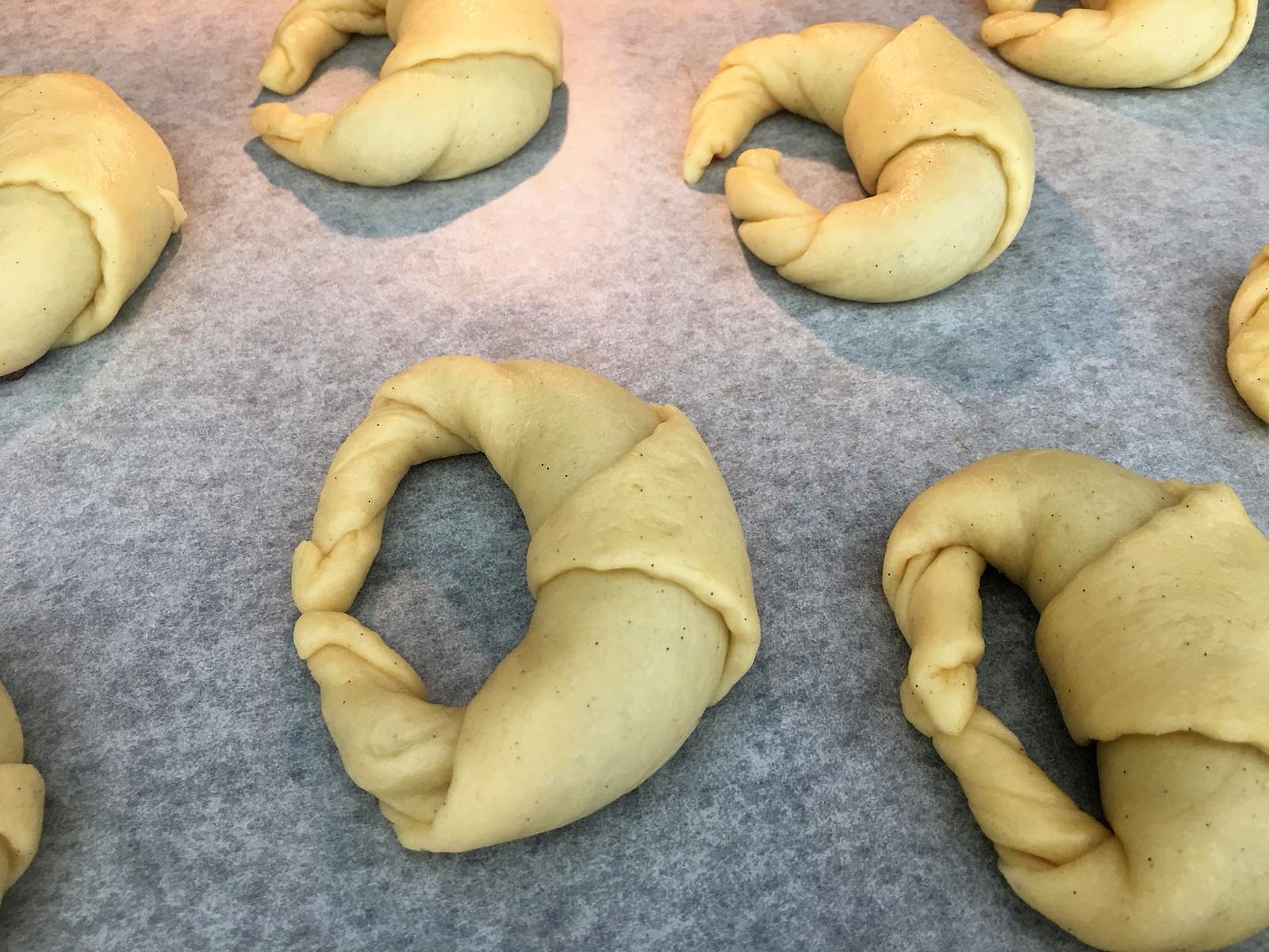 - Foderate una teglia con carta forno e adagiate i cornetti tenendoli un po’ distanti l’uno con l’altro. Fateli lievitare nello stesso modo usato per la prima lievitazione per alti 60 minuti.