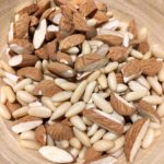3. Ponete l’impasto su una spianatoia infarinata e appiattitelo leggermente con la punta delle dita. Nel centro versate mandorle, pinoli e cioccolato e incorporateli insieme all’impasto lavorando il tutto velocemente con le mani.