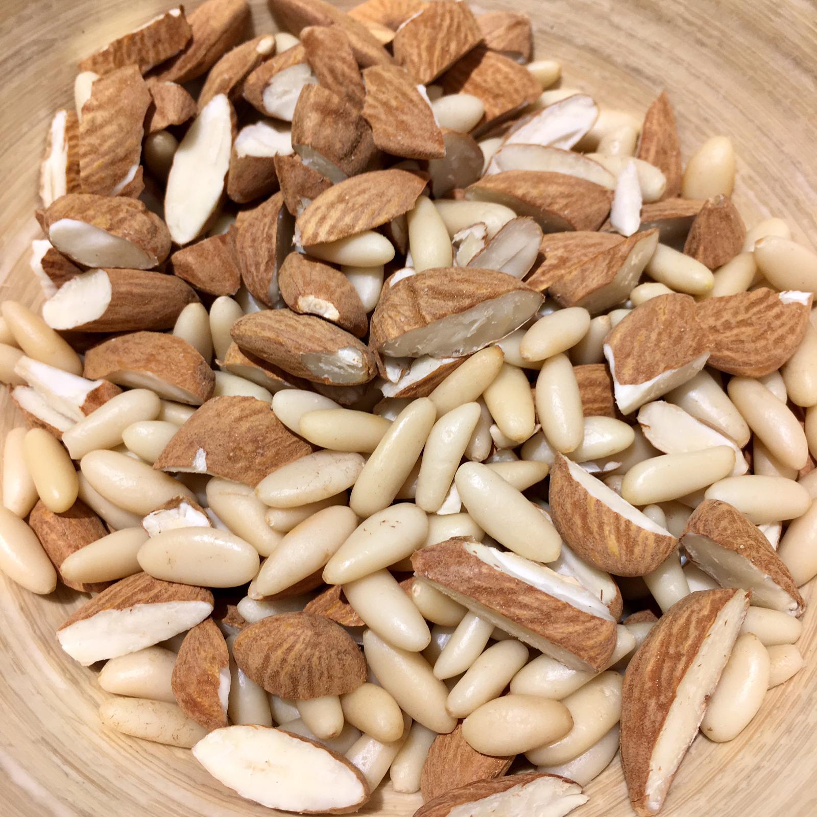 2. Inserite nella ciotola della planetaria tutti gli ingredienti tranne mandorle, pinoli e cioccolato. Fate lavorare la foglia fino a quando tutti gli ingredienti vengono incorporati perfettamente tra di loro. Otterrete un composto compatto e leggermente appiccicoso, se si attacca troppo alle dita e non riuscite ad estrarlo dalla ciotola dovrete aggiungere un cucchiaio di farina e si aggiusterà. Potete lavorarlo anche energicamente a mano.