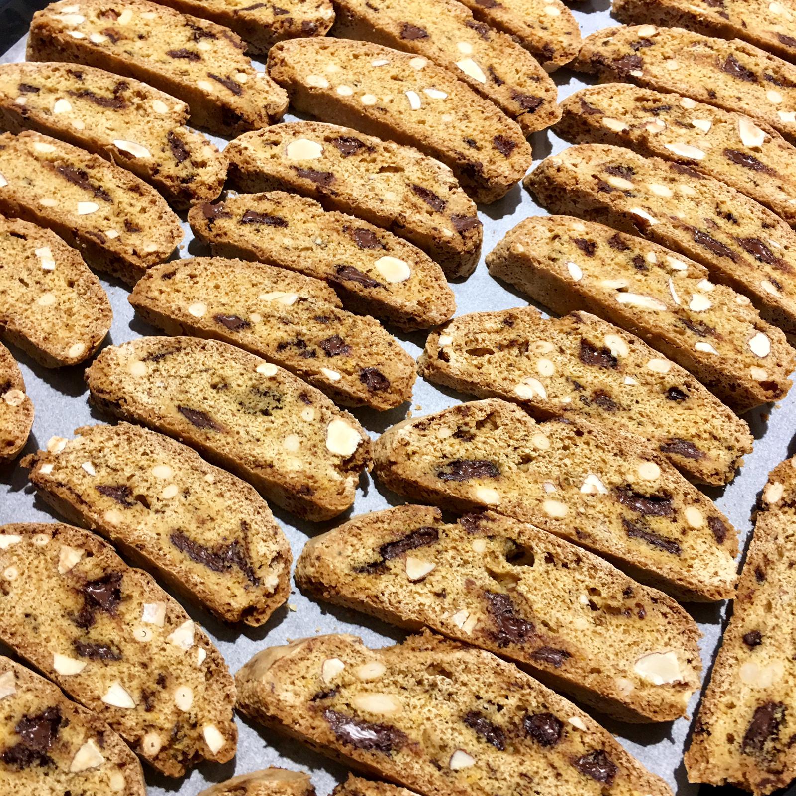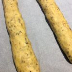 7. Disponete i cantucci semicotti su una teglia rivestita di carta forno e lasciateli seccare in forno statico a 110° per 50 minuti ponendoli a metà forno esatto.