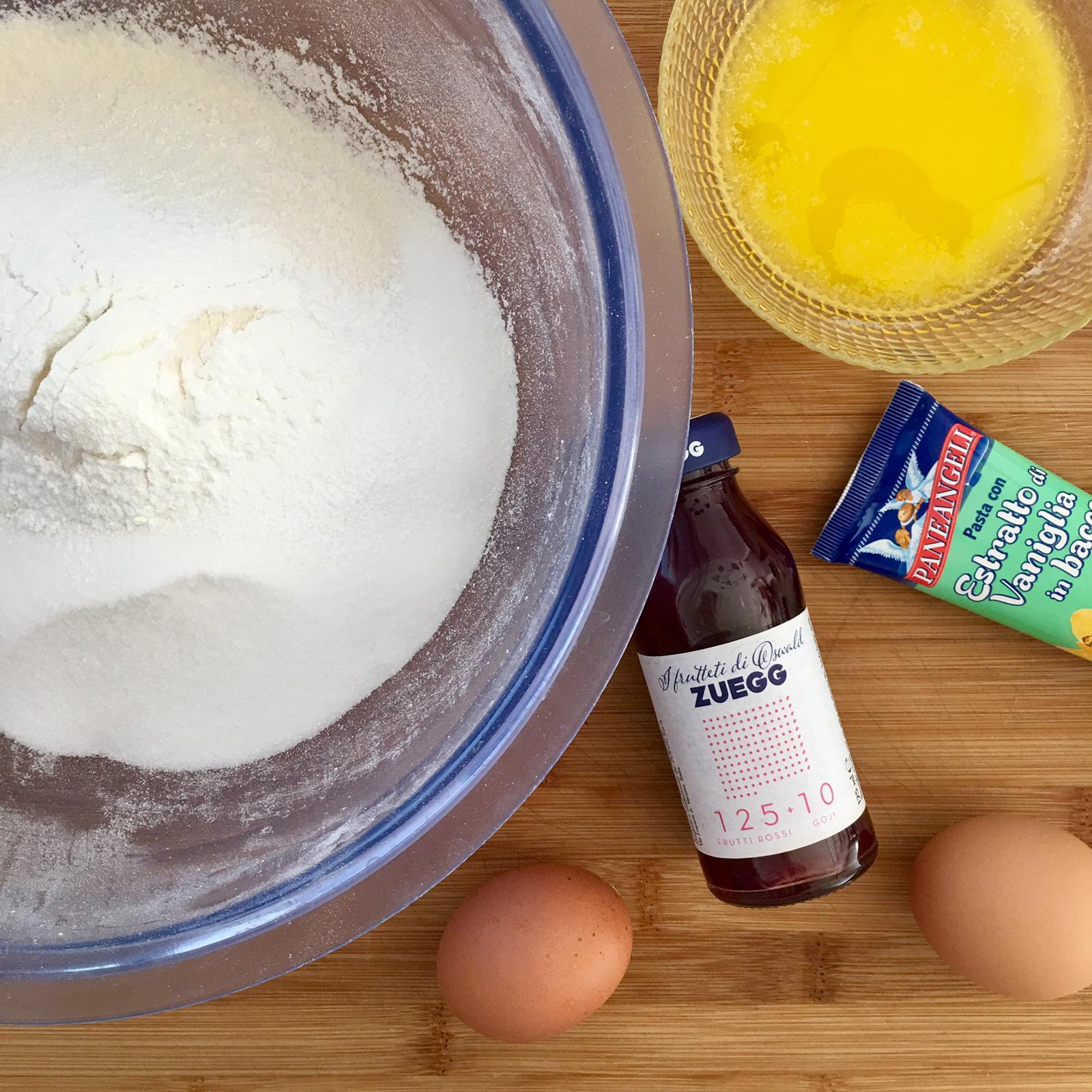 - In un’altra ciotola invece inserite il burro freddo, le uova e l’estratto di vaniglia. Frullate per poco tempo (l’impasto non deve essere montato ma si devono solamente mescolare gli ingredienti tra di loro) e aggiungete il succo di frutta in una volta sola. Frullate ancora per circa un minuto.