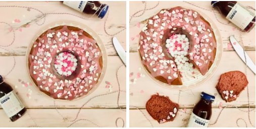 - Versate immediatamente la glassa sulla ciambella fredda per evitare che si solidifichi e decorate a piacere con cuoricini, codette, gocce di cioccolato bianco ecc.