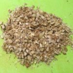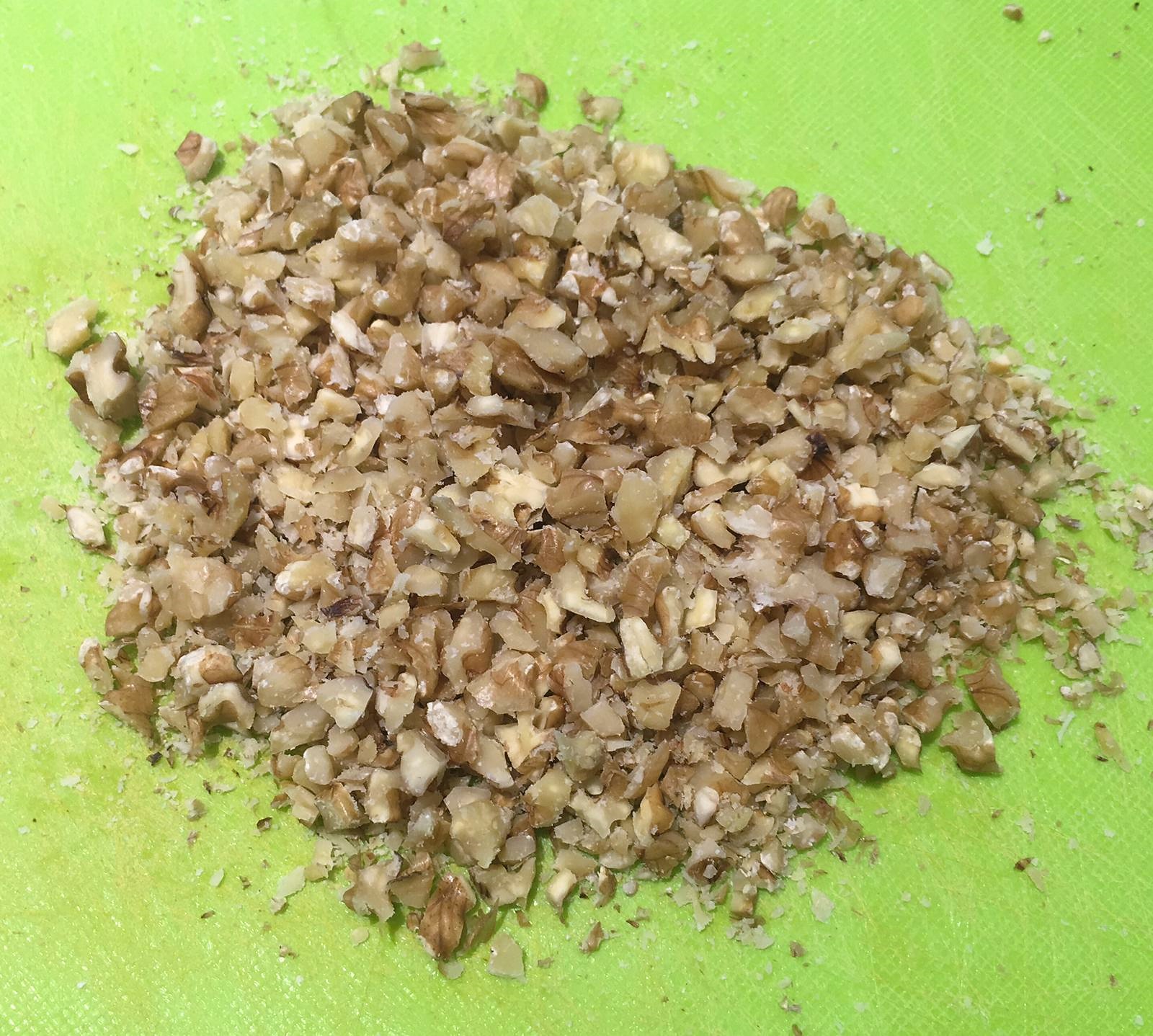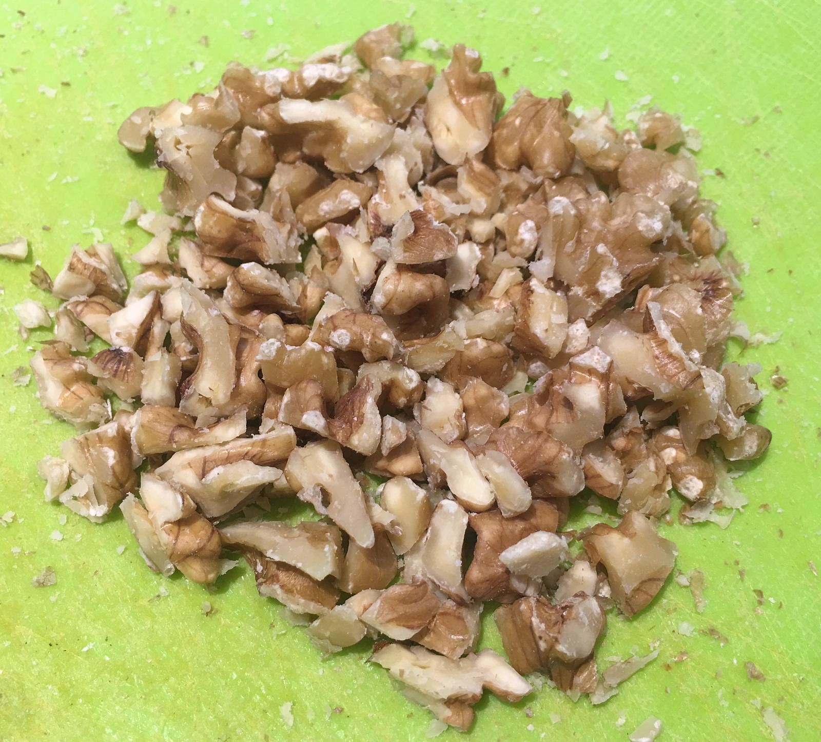 1. Iniziate la preparazione del ciambellone dividendo la quantità delle noci: 50 gr mer l’impasto e 30 gr per la decorazione. Tritate in maniera più grossolana quelle per il decoro finale, le altre invece in pezzettini più piccoli. Tagliate una mela a fettine sottili o a dadini e irroratele nel succo di mezzo limone per non farle annerire. Grattugiate la buccia di un limone.