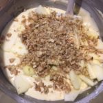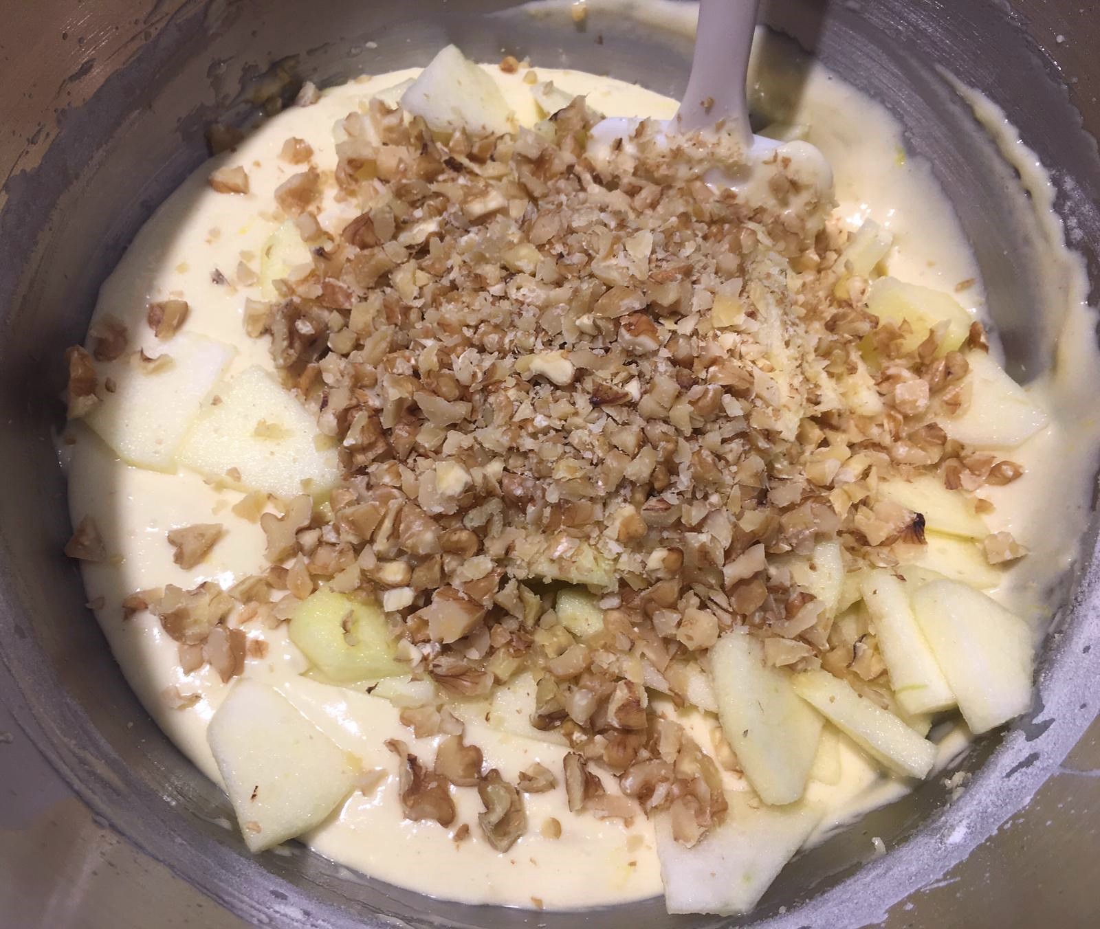 5. Inserite anche le mele ben scolate dal succo del limone e le noci tritate più finemente amalgamando bene il tutto.
