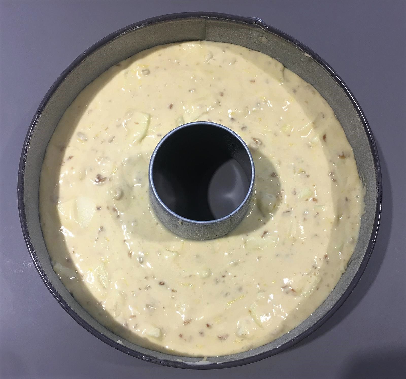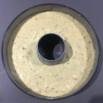6. Imburrate ed infarinate uno stampo da ciambella di 26 cm o in alternativa una tortiera da 24 e versate l’impasto livellandolo con una spatola.