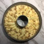 7. Tagliate al momento a fettine sottili la seconda mela e disponetela a raggiera sull’intera ciambella non premendola ma solamente appoggiandola. Distribuite le noci tritate grossolanamente ed infine spolverizzate con dello zucchero di canna per lucidare.