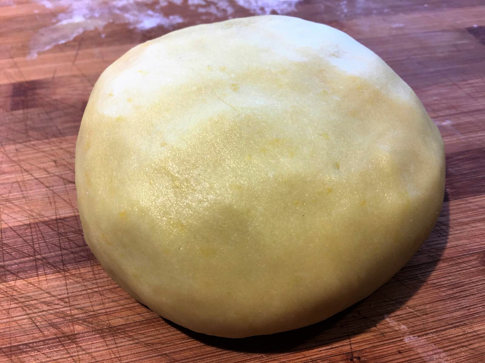 - Mettere in una terrina le farine e lo zucchero con al centro il burro freddo e ridotto in tocchetti. Lavorare velocemente formando delle briciole, aggiungere il tuorlo, l’acqua e finire di impastare sulla spianatoia.