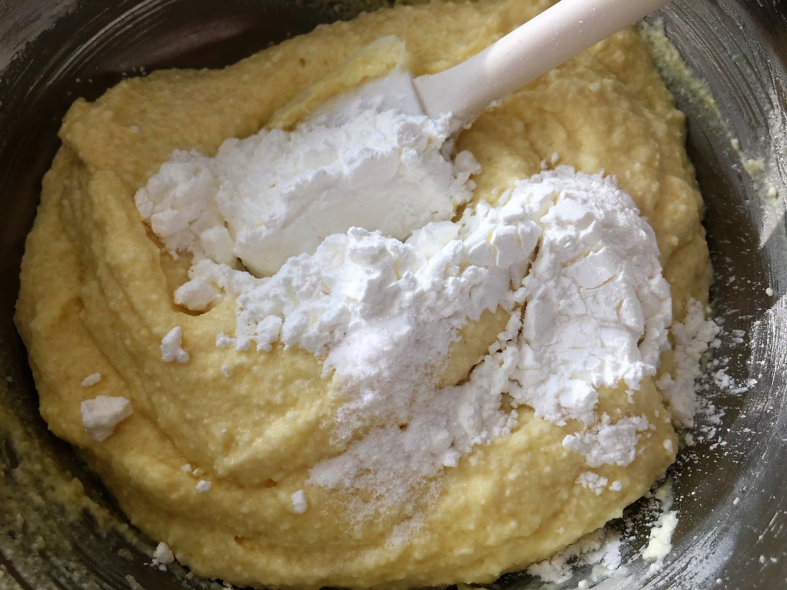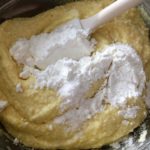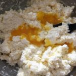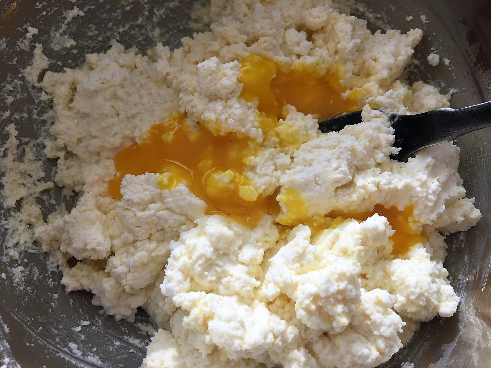 - Setacciare la ricotta e, lavorando a mano con una forchetta, unire un tuorlo alla volta, l’uovo intero, lo zucchero, l’amido di mais e la vanillina