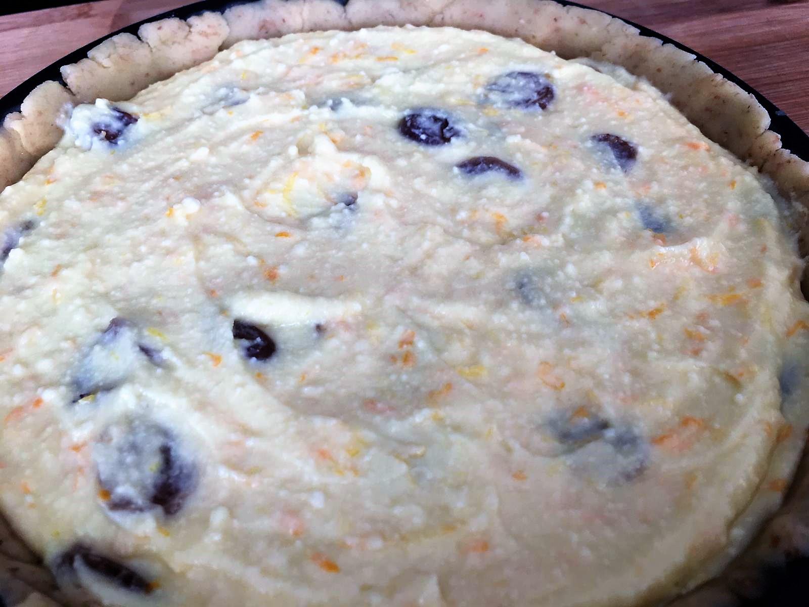 - Adagiatela nello stampo imburrato ed infarinato bucherellando la base con la forchetta. Riempite e livellate con il composto di ricotta.