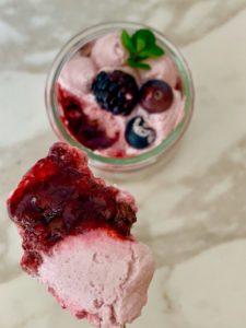 DESSERT CON MOUSSE E PUREA DI MIRTILLI E MORE