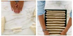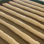 - Ribaltate l’impasto su di un piano di lavoro che non deve essere nè bagnato nè unto, sgonfiatelo delicatamente e dividetelo in 4 parti. Ricavate dei filoncini con un tarocco che devono pesare 27/30 gr circa. Rollateli su loro stessi allungandoli man mano e disponeteli in teglia microforata con tappetino di silicone (se non lo avete utilizzate una comune teglia rivestita da carta forno. Coprite con canovaccio di cotone e di nuovo a lievitare per 2 ore e mezza.