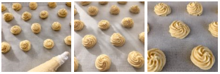 - Riempite la sac-a-poche per i 3/4 e cominciate a fare i vostri biscottini della forma che desiderate ma cercando di farli più o meno della stessa misura. Io ho voluto farli circolari, a ciuffo, potete farli a “S” oppure a bastoncini dritti se siete alle prime armi con questo attrezzo da pasticceria.