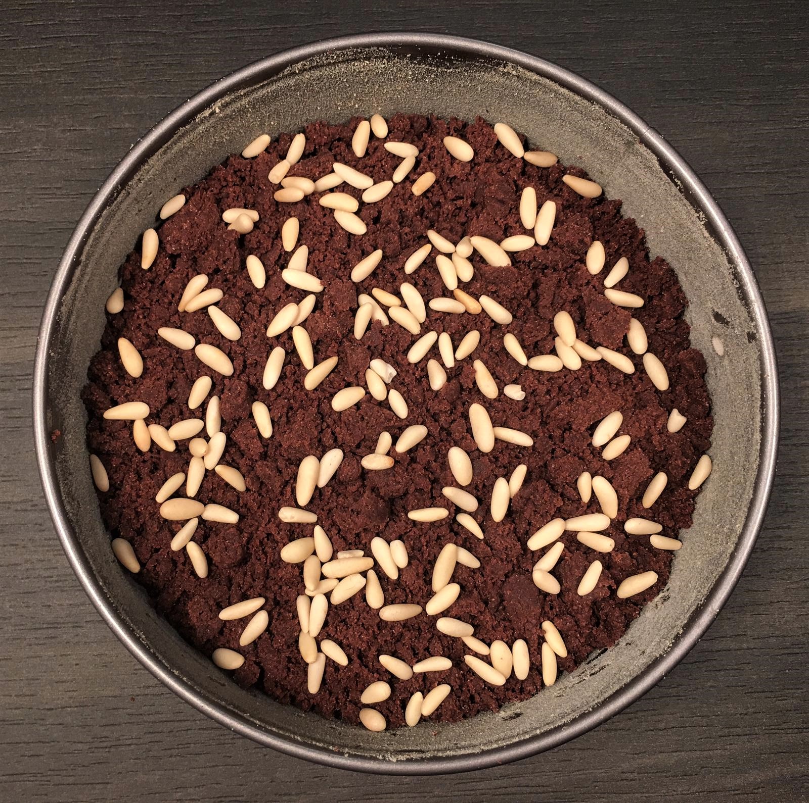 5. Imburrate ed infarinate una tortiera da 20 cm con cerniera apribile, questo perché permette di trasferire la torta finale su un piatto senza doverla ribaltare, altrimenti i pinoli si staccheranno.