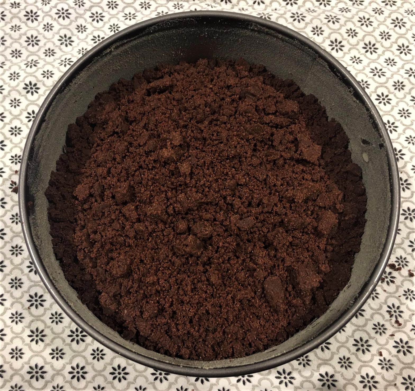 6. Versateci metà delle briciole schiacciandole con un cucchiaio o aiutandovi con il palmo della mano in moda da livellarle e creare la base.