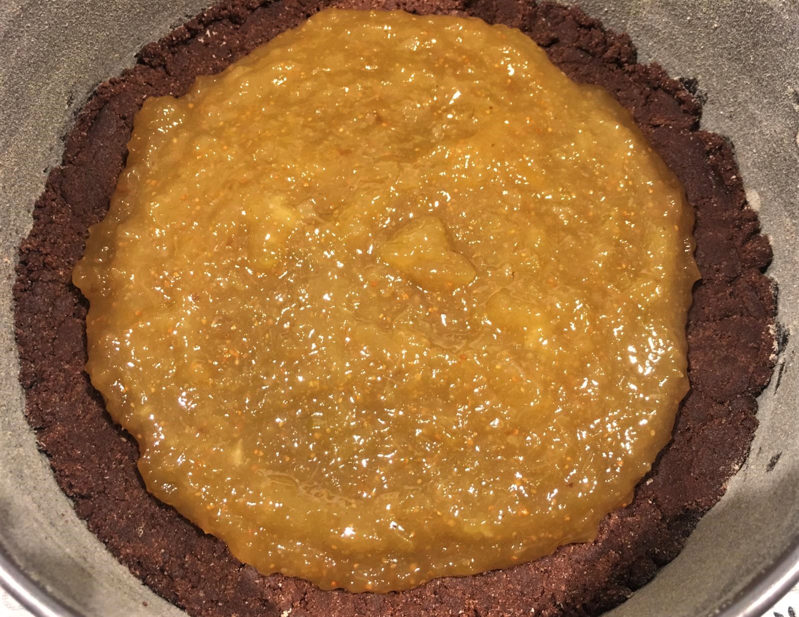 7. Aggiungete la marmellata di fichi stando staccati lungo tutto il diametro della crostata di un centimetro.