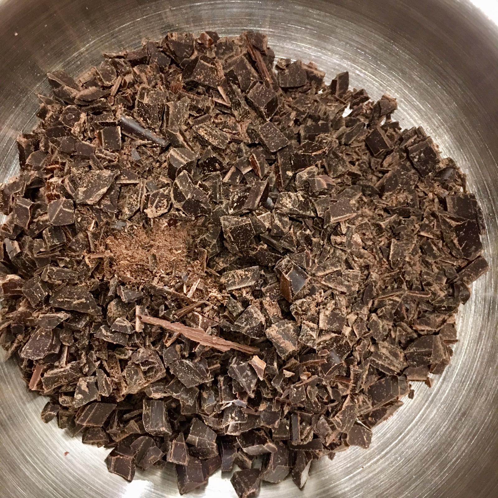- Iniziate la preparazione fondendo a bagnomaria il cioccolato fondente ridotto a pezzettini piccolissimi, attenzione a non far entrare neanche una goccia di acqua altrimenti si rovina, scurendosi e bruciandosi.