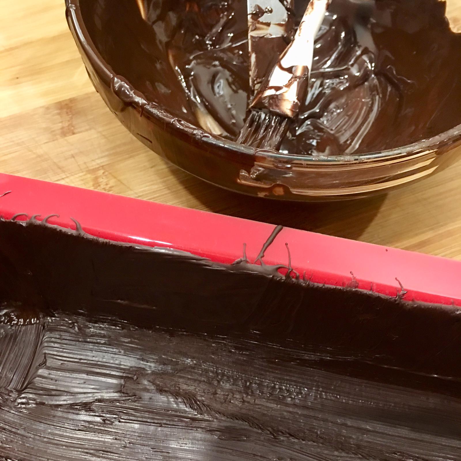 - Con l’aiuto di un pennello spennellate l’intero stampo da plumcake con il cioccolato fondente. Riponetelo in frigo ad asciugare 5 minuti, ripetete quindi l’operazione di prima e riponetelo di nuovo in frigo.