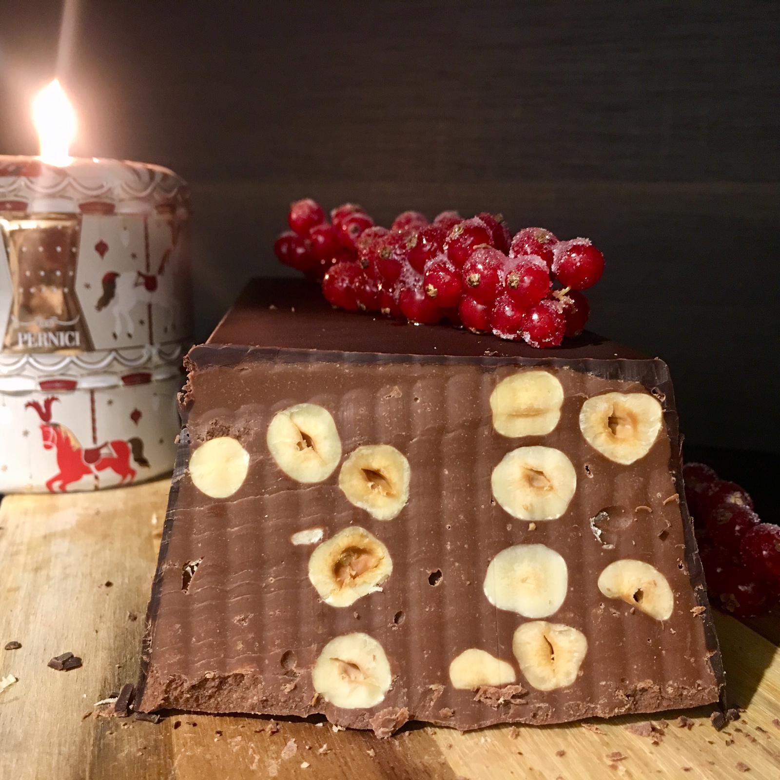 - Trascorso il tempo necessario alla solidificazione del torrone potete sfoderarlo. Aiutatevi con un coltello a punta finissima: incidete il cioccolato a filo del bordo dello stampo facendo passare la lama del coltello tra il torrone e la parete dello stampo in modo da staccarlo senza danni al guscio. Sentirete una sorta di “crack” indice che il guscio si è staccato dalla parete. Capovolgete lo stampo su un assetto di legno e battete sopra con mano ferma e decisa, vedrete che si sformerà perfettamente. Se invece, come nel mio caso, usate uno stampo in silicone l’operazione sarà facilissima perché si sfodera perfettamente.