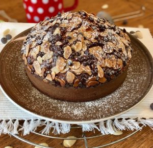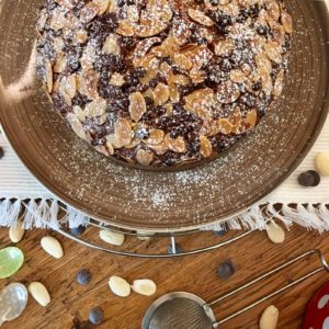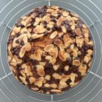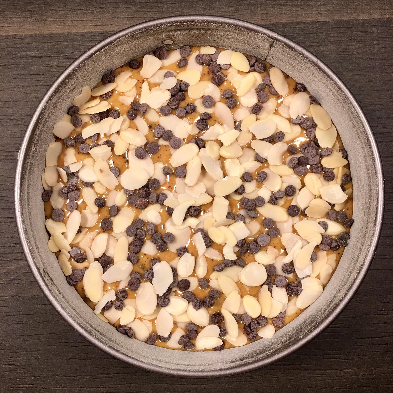 6. Decorate la superficie della torta con le lamelle di mandorle e delle gocce di cioccolato ed infornate in forno statico a 185° (precedentemente riscaldato) per 60 minuti, facendo sempre la prova stecchino prima di sfornarla.