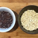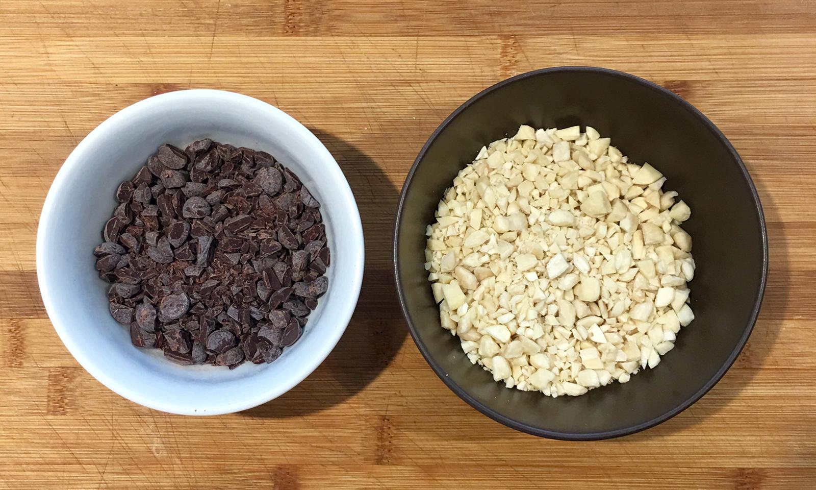 1. Iniziate la preparazione della torta tritando grossolanamente con l’aiuto di un coltello le mandorle e la tavoletta di cioccolato fondete. Teneli da parte per quando serviranno.