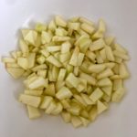 - Cominciate la preparazione della torta tagliando la mela e mezza che avete a disposizione in piccoli quadratini e irroratela con del succo di limone per non farla annerire (l’altra metà lasciatela a parte che servirà alla fine).