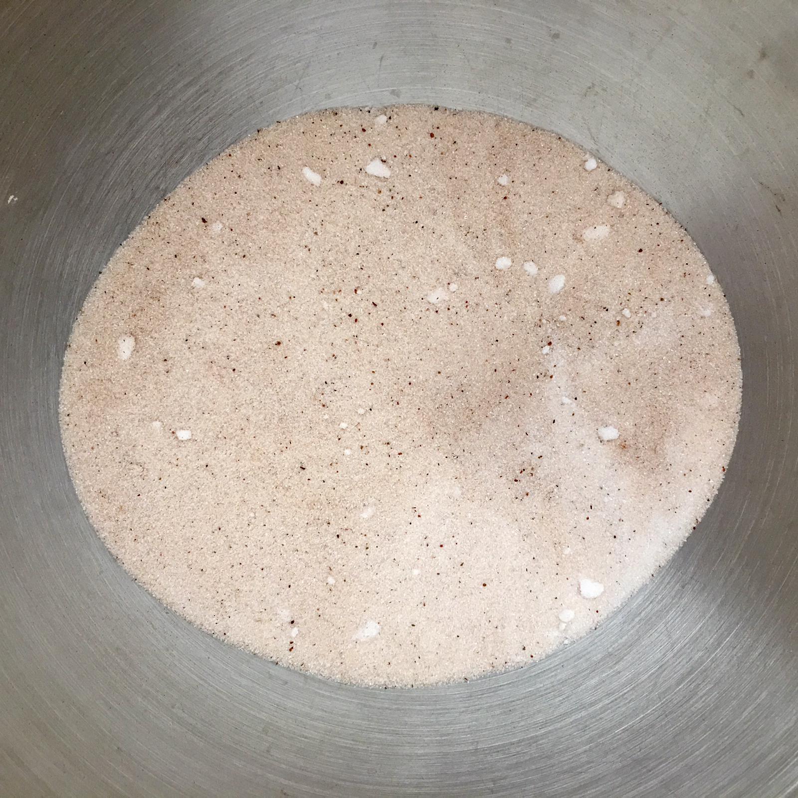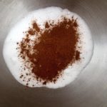 - In planetaria (oppure in una ciotola capiente) mettete lo zucchero e la cannella e mischiate bene le due polveri. Aggiungete le uova intere e montate alla massima velocità per almeno 5 minuti fino a che otterrete un composto molto montato e spumoso.