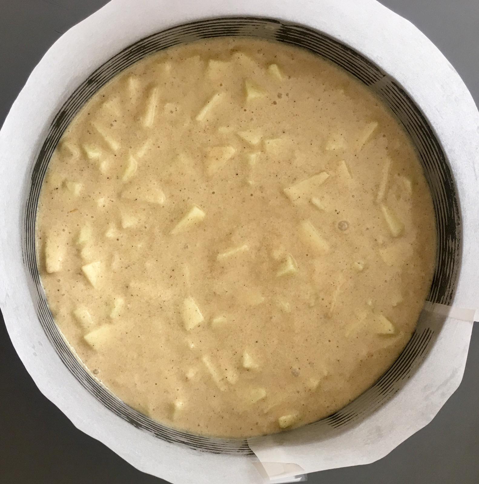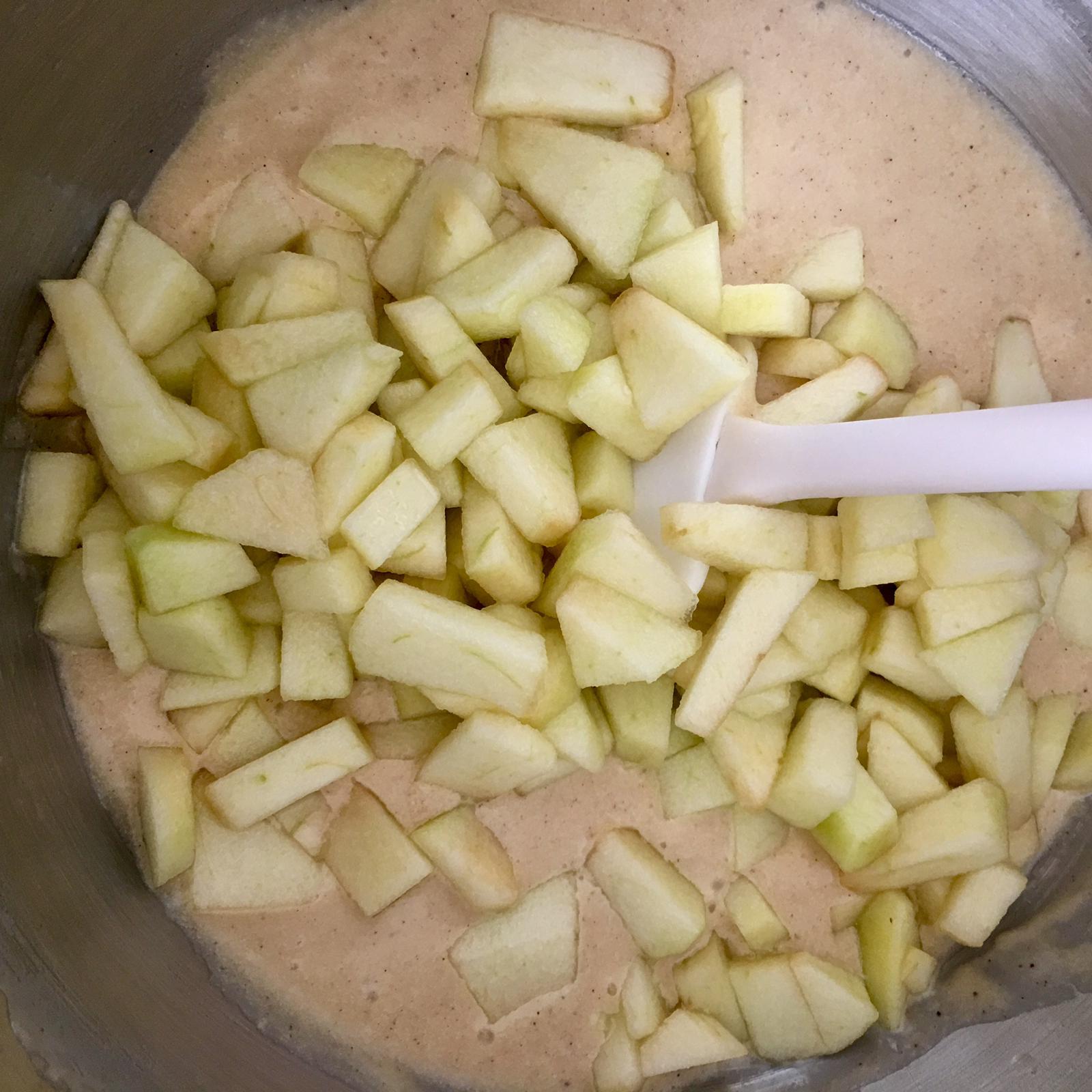 - Unite le mele tagliate a quadratini insieme al succo del limone rilasciato (non scolatele) e con una spatola incorporatele all’impasto.