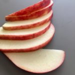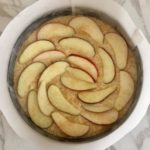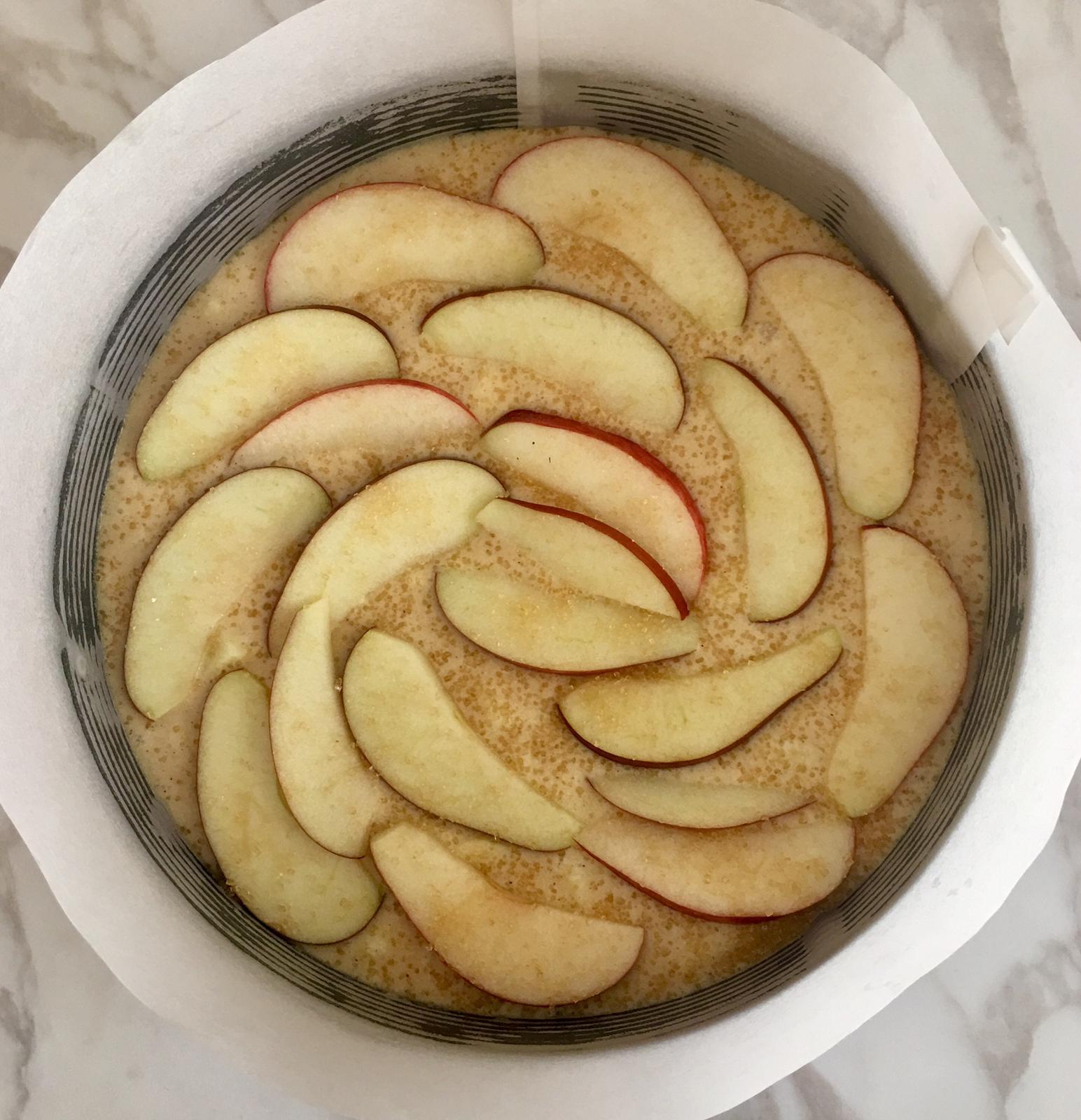 - Tagliate a fettine la restante metà mela non togliendo la buccia e disponetela a piacimento sull’intera torta.