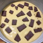 4. Dividete la quantità dell’impasto perfettamente a metà e versate la prima parte nella tortiera imburrata ed infarinata. Sopra di esso adagiatevi 100 gr di tavoletta rotta a pezzi con le mani.