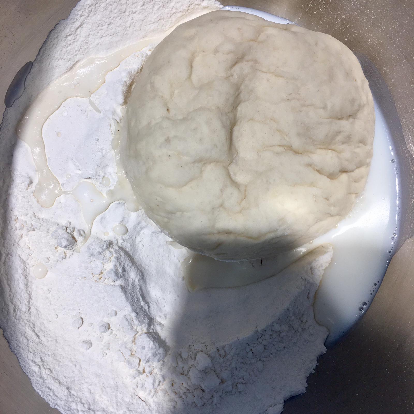 3. A questo punto cominciate l’impasto inserendo in planetaria le due farine setacciate, il latte tiepido (non caldo) e il lievitino facendo lavorare il gancio per 5 minuti.