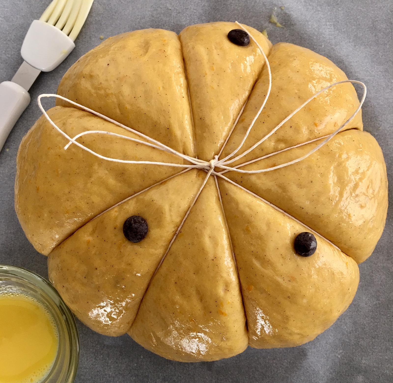 8. Con lo spago da cucina legate la brioche in modo da darle la classica forma da zucca. Non stringete troppo lo spago perché con la successiva lievitazione si allargherà naturalmente.